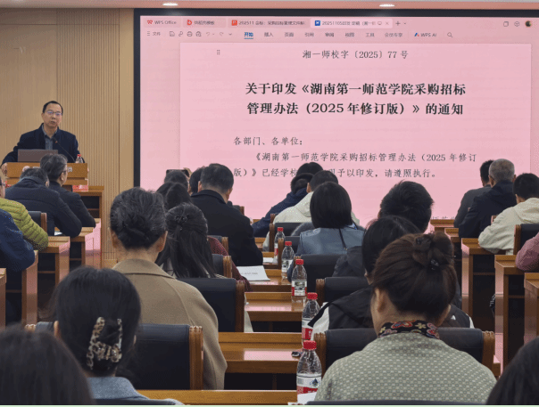 为深入贯彻落实国家采购招标相关政策法规,进一步提升学校采购工作的规范化、专业化水平,11月11日上午,我校在百熙楼414会议室组织召开了《湖南第一师范学院采购招标管理办法(2025年修订版)》(湘一师校字〔2025〕77号)文件解读宣讲会议。各职能部门、二级学院采购工作负责人及具体实施人员参会,会场座无虚席。